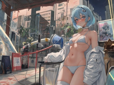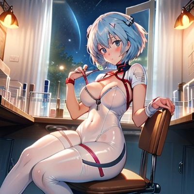 ((masterpiece)), ((best quality)), (ultra-detailed), laboratory, night, Rei Ayanami, Evangelion, latex bodysuit, ((beautiful eyes)), buttocks, large breast, bandage, cool, blush,
