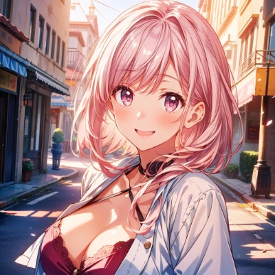 best quality, masterpiece,1woman, solo, turn off the light, stand light, kawaii female,30 years old,hdr,eyes,gleam pink medium hair ,(realistic:1.2),large breast,large eyes,round face,resigned look,magical girl,(outdoors, street),most spectacular magic,BREAK,(,Happiness:1.5),<lora:add_detail:1>