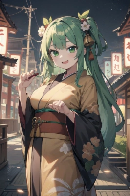 Masterpiece, high quality, one girl,cute and pretty and beautiful girl, long hair, two side up hair, green hair, green eyes, big breasts, kimono, haregi, long-sleeved kimono, shrine, New Year@!@s Eve, 8k <lora:eyecolle_colchicum_v100:1> <lora:eyecolle_himawari_v100:1> ,