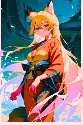 (kimono, Furisode:1.8), (new year:1.3), shrine, close to viewer, cowboy shot, smile, cinematic angle, (masterpiece, best quality, top quality, ultra detailed, 8k, highres, HDR, beautiful detailed:1.4), (Otaku, Bisyoujo, Anime art, illustration:1.4), AzurLane, large breasts, ezo, 1girl, solo, animal ears, fox ears, long hair, fox tail, blonde hair, hair between eyes, very long hair, fox girl, brown tipped ears, brown tail, <lora:ezo:0.7>