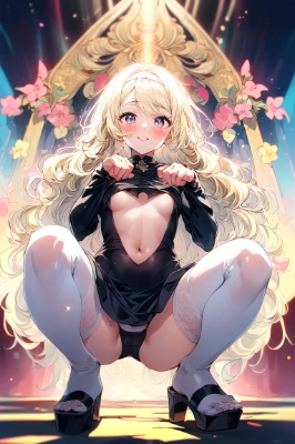 masterpiece, best quality, extremely detailed, (brushwork of Alfons Mucha, Art nouveau:1.5), (hyperrealistic, blurred, bounce lighting:1.4), (a pure and lustful girl, big slant eyes, platinum blonde hair, extra long wavy hair, short height, slim body, flat chest, pale white skin:1.6), multi-colored hair, (parted bangs:1.4), (seductive smile, kissable lips:1.4), (cosplaying, cleavage cutout, sideboob, underboob, black sheer nun outfit, detouched sleeves, cheeky low rise micro panties under dress, under navel pink heart tattoo, white sheer thigh highs, Heeled Sandals:1.3), (paw pose, squatting, show off panties:1.2), (looking at viewer, front shot, from below:1.5), energetic compositions, (abstract rays, abstract scatters:1.4), (motion blur, chromatic_aberration:1.2), (abstract background:0.8), <lora:flat2:-0.95> <lora:boldline:-1>,