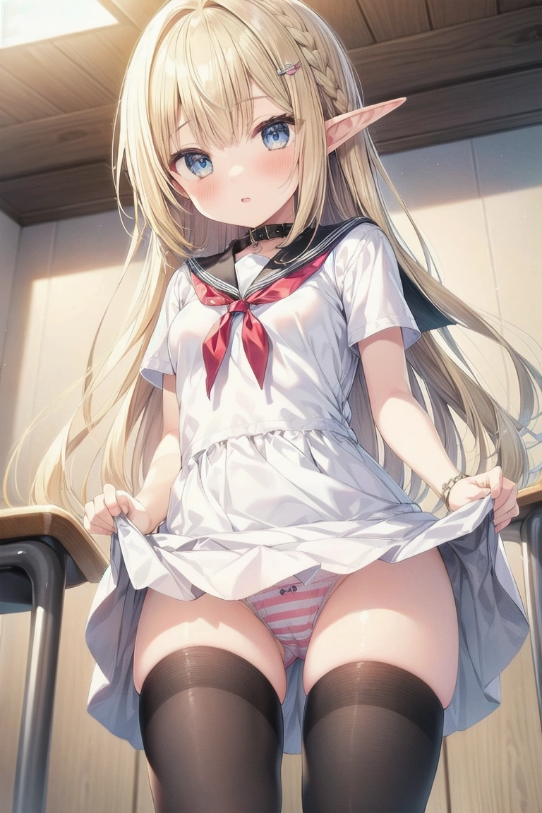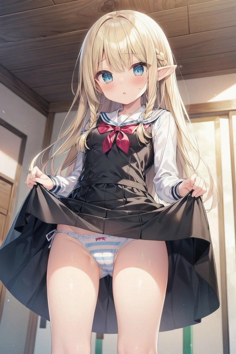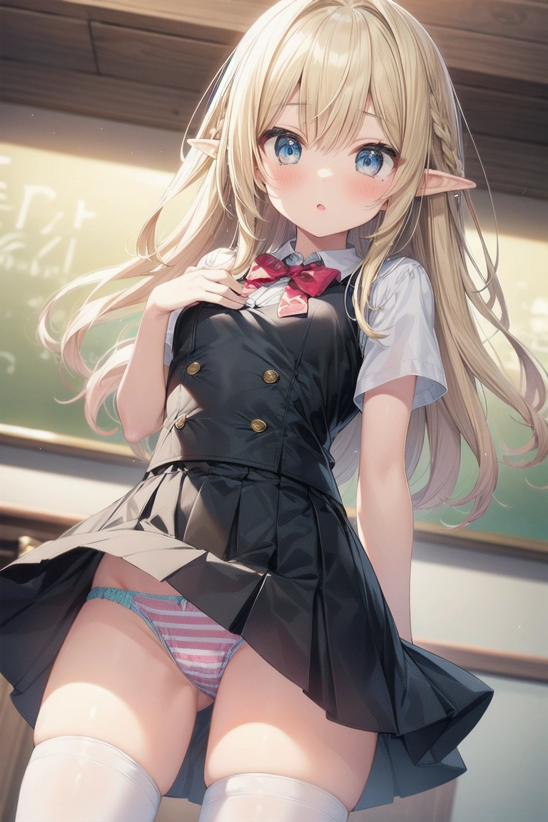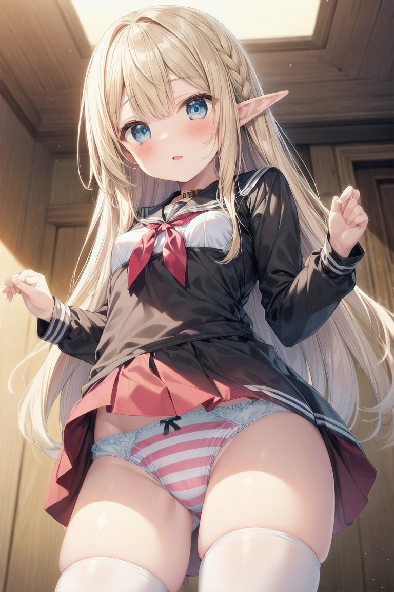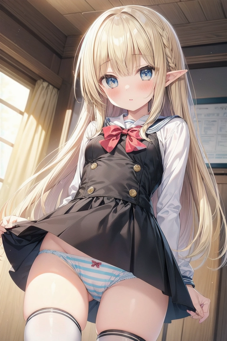 1girl, ((masterpiece)), ((best quality)), (ultra-detailed), ((kawaii)), (lovely),game cg,12years old,((small breasts:1.3))braids, longhair,blonde hair, odd eyes, elf,hair intakes:1.3,red collar:1.3, ojou-sama, school uniform:1.3,zettai ryuoiki,striped pattern cotton panties,panties shot,from below,bashful,,
