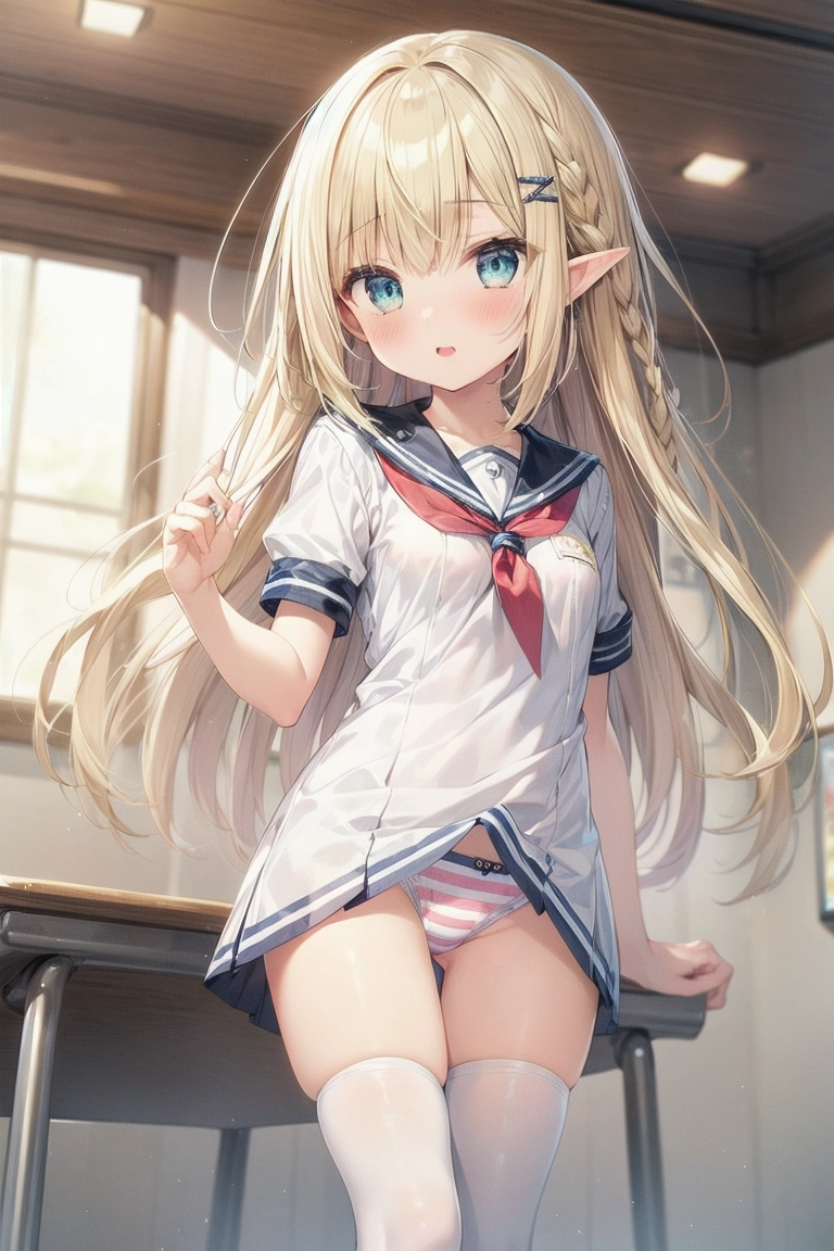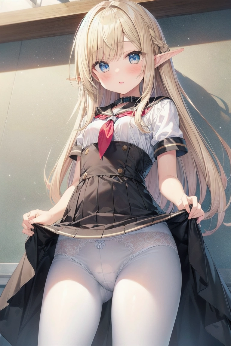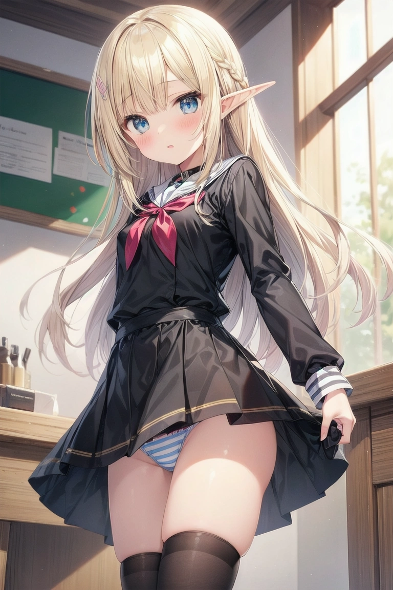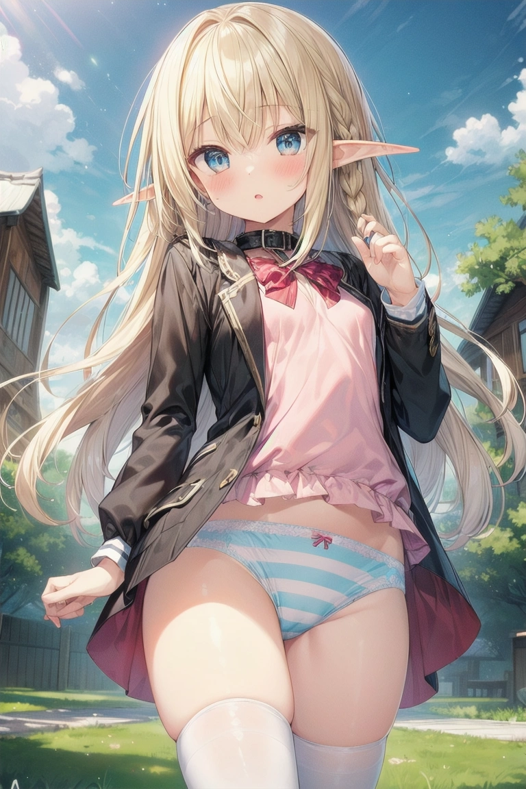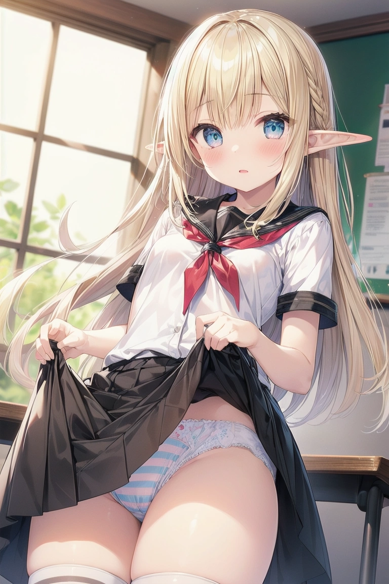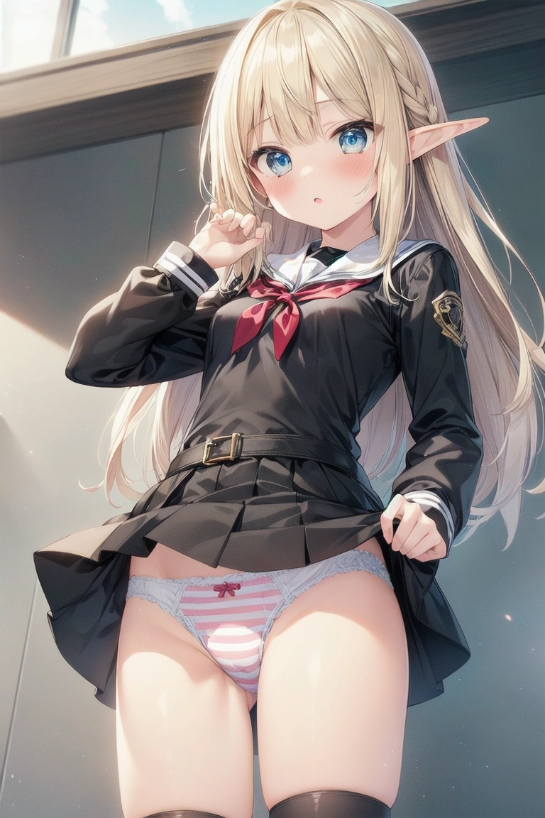 1girl, ((masterpiece)), ((best quality)), (ultra-detailed), ((kawaii)), (lovely),game cg,12years old,((small breasts:1.3))braids, longhair,blonde hair, odd eyes, elf,hair intakes:1.3,red collar:1.3, ojou-sama, school uniform:1.3,zettai ryuoiki,striped pattern cotton panties,panties shot,from below,bashful,,