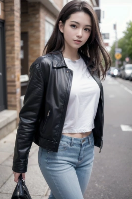 (photorealistic:1.4), (RAW photo), masterpiece, best quality, extremely detailed, photorealistic, lady, long hair, straight hair, Almond-shaped Eyes, smile, riders jacket, leather jacket, denim pants, jeans, jockey boots, leather boots, stroll, town, autumn,