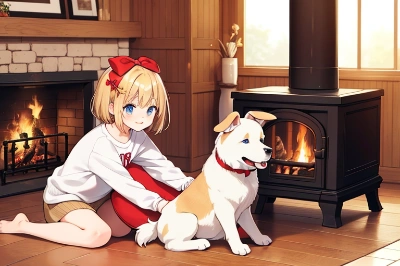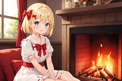 1girl, sitting, smile, red ribbon, white dress, short hair, blonde hair,(hair bow:1.3),red bow, blue eyes, indoors, fireplace, burning firewood, warm light, detailed eyes, detailed face, detailed hair, solo, (fire:1.2), extremely beautiful