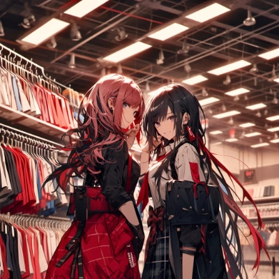 after school, shopping, red eyes, multicolored hair, looking at viewer, black hair, necktie, shirt, smile, red hair, collared shirt, purple necktie, streaked hair, white shirt, bangs, short hair