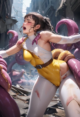 (very aesthetic, best quality:1.1025), absurdres, best quality, amazing quality, very aesthetic,(amazing quality:1.15763), (great quality,best quality, high quality:1.1025), (realistic:1.05), aesthetic, game CG,-Char-(super sentai:1.27628), baby-face,cute, acorn eyes, (white bodysuit:1.1025), (yellow leotard:1.1025), skin tight sleeves,white gloves,(yellow latex:1.21551), belt,black ponytail, thick thighs, serious, teeth, embarrassed,disgrace,dirty, bruise, skin pores, despues,torn clothes, clothes piece, (luster:1.15763), (battle damage:1.15763), raised eyebrows, open mouth, closed eyes, (scream:1.05), (arched body:1.15763), (electric shock:1.15763),wet, tentacles are attached, (white aura:1.27628),(be defeated:1.1025), bind withtentacles, (defeat:1.4071),BREAK lying, on stomach,silly, sweat, trembling,Collapsed city,Collapsed building, <lora:flat2:1> <lora:hairdetailer:0> ,