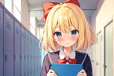 anime style girl, blonde short hair with blue eyes and red ribbon, lying in bed, alarm clock ringing beside her, expressing reluctance to leave the warmth of the bed, cold winter morning, hesitating to stop the alarm clock, wrapped in blankets, cozy bedroom atmosphere, window showing the early morning light, shivering slightly, sleepy and reluctant expression, wanting to stay in bed, (hair color:blonde)(eye color:blue)(accessory:ribbon:red:1.1)(setting:bedroom, cold winter morning)(activity:lying in bed with alarm clock ringing)(emotion:reluctance, sleepiness)(condition:wrapped in blankets, shivering)(expression:wanting to stay in bed but needs to stop the alarm)