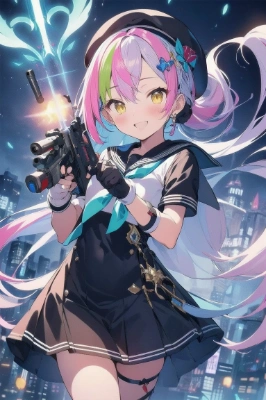 ((Chibis)),Down,(((tear))),(((Cry))),(((garage))),Glaring,Black mechanical arm,blush,((Black mecha headgear)),midnight,Black ribbon,((Black dress)),(((magical girl))),(((zoido))),((Blue hair)),Black stocking,Black Cybersuit,Starry prismatic night,(masterpiece), (best quality), (ultra-detailed), ((illustration)), cinematic lighting, (caustic), lens flare,beautiful detailed glow, <lora:sensualface_type1:1> ,,
