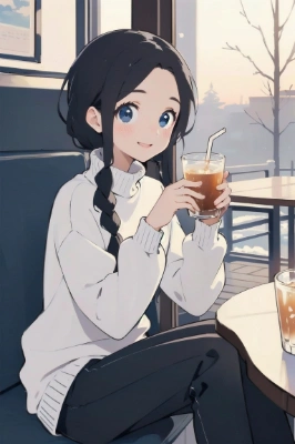 masterpiece, best quality, extremely detailed, anime, 1girl, long sleeve, white turtleneck sweater, black skinny pants, black hair, braids, ahoge, black eyes, tall, skinny type, have a small bust, idol, kpop, original character, my child, cafe, healing, sitting, drinking, a cup of espresso, smiling, happy, winter, sky, evening sun <lora:flat1:1> <lora:eyecolle_portulaca_v100:1> ,