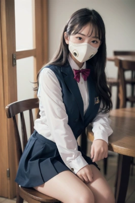 (photorealistic:1.4), (RAW photo), masterpiece, best quality, extremely detailed, girl, neat and clean, (Respirator:1.2), white shirt, big ribbon bow tie, navy blazer, pleated skirt, class room, study, pen, notebook, sitting,