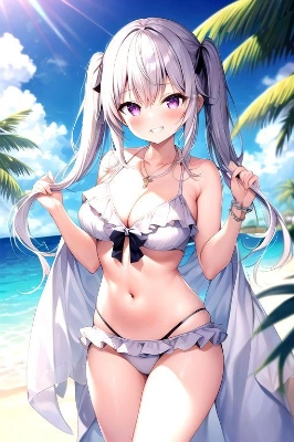 1girl, solo, long hair, breasts, looking at viewer, smile, large breasts, ribbon, navel, holding, cleavage, bare shoulders, twintails, jewelry, standing, purple eyes, collarbone, swimsuit, hair ribbon, white hair, bikini, thighs, cowboy shot, outdoors, frills, sky, day, cloud, necklace, stomach, grin, bracelet, bare arms, ocean, halterneck, white bikini, beach, sunlight, string bikini, frilled bikini, holding hair, multi-strapped bikini