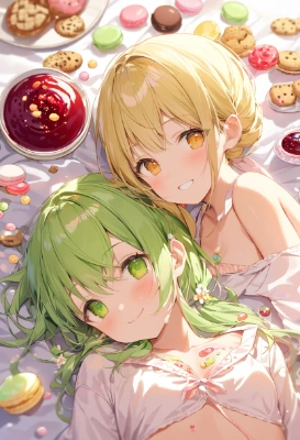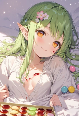 white day,cookie,candie,lolipop,(colorful jam on body:1.2),(sweets on body:1.2),(jam on cheek:1.2),present,macaron,lie on the back,open tops,downblouse,(gradation yellow green hair), [yellow hair],Chignon hairstyle, The ends of the hair are yellow tip,elf ,face to face,flower hair ornament,short ear,solo,1 woman,slender,best quality, (((extremely masterpiece))),best quality, extremely detailed,a pretty woman, shoulder length hair,amber eyes,elf, beautiful small breasts,cleavage,great joy,smile,looking at viewer, <lora:hairdetailer:1> <lora:asb-CH1:0.2> <lora:darkness_v100:1> <lora:sensualface_type2:0.75> ,cowboy shot,lots of small orbs, starry,galaxy,,delicate girl,eat sweets,,,,,,,,,