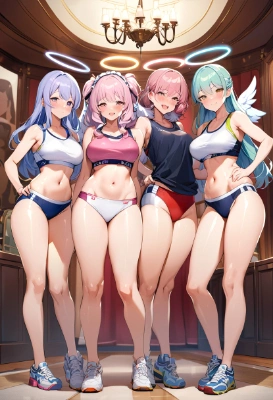 group of women, track and field wear, no sleeve, short and tight tops, midriff-baring, soft midriff, navel, high leg cut buruma, shiny thighs, shy, smile, ruffle headdress, angel halo, white big wings, standing, inside the western style mansion,,