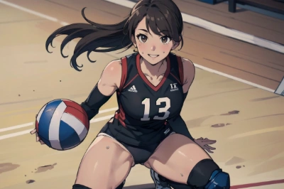 masterpiece, best quality, high definition images, atmospheric perspective, expressive eyes, perfect face, ultra detailed, intricate detailed, (solo, 1mature woman, female volleyball player, red and black volleyball uniform, sleeveles, brown semi short hair, elbow pad, knee pad, smile, open mouth, sweaty, crawling down and open legs on floor, stretching body, focus ass, panties line, shoot from behind and below, in volleyball court),,