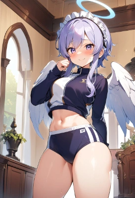 adult woman, androgynous, ruffle headdress, angel halo, white big wings, standing, inside the western style mansion, track and field wear, no sleeve, short and tight tops, midriff-baring, soft midriff, navel, high leg cut buruma, shiny thighs, shy, smile,