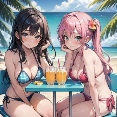 (best quarity:1.2),masterpiece,2girls,bishoujo,teenager,(glamor:1.2),cute sexy bikini,cute smile,sitting on cute beach chair,(head rest:1.2),(There is a delicious looking tropical juice on the table in front of them:1.2),sunshine,