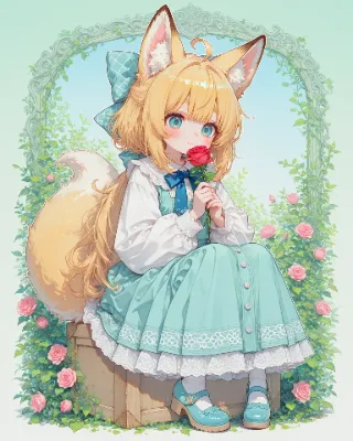 animal ears,fox ears,long hair,fox girl,kneeling,room,carpet,