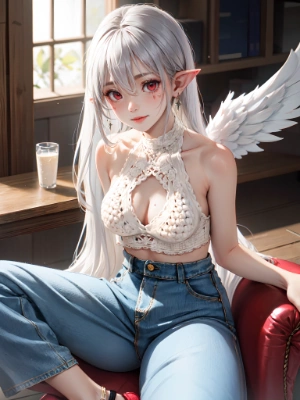 (1 Angel little girl), (scar face), (a lot of scars skin:1.4), wound, (light silver hair), (red eyes), (small breasts), (angel big wing:1.3), (broken wing), (halo:1.1), cleavage, (pointy ears), expressionless, (absurdly long hair), (hair between eyes),