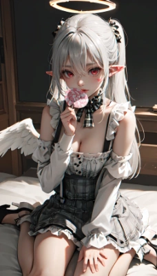 (1 Angel little girl), (scar face), (a lot of scars skin:1.4), wound, (light silver hair), (red eyes), (small breasts), (angel big wing:1.3), (broken wing), (halo:1.1), cleavage, (pointy ears), expressionless, (absurdly long hair), (hair between eyes),