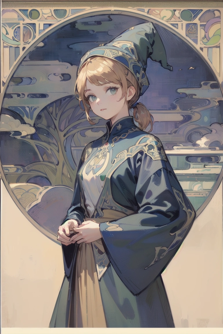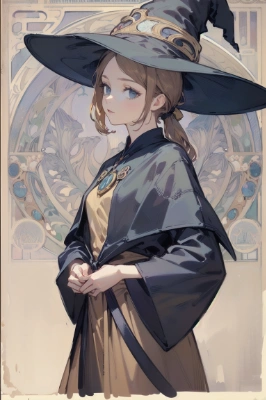 masterpiece,1girl,best quality,dynamic angle,extremely delicate,(by famous artist, art nouveau:1.4),photo realistic details,cowboy shot,yellow long sleeve,chocolate hair,chocolate skirt,ponytail,(looking at views:1.2),gold background,(chocolate:1.2),(witch:1.2),(hat:1.3),,