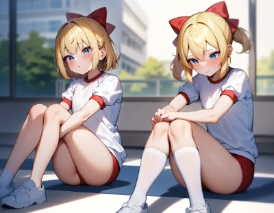 masterpiece, best quality, very aesthetic, absurdres,multiple girls,loli,blond hair,short hair,hair bow,red bow,blue eyes,gym uniform, buruma,sitting on the floor grasping her's knees ,crossed legs, school campus,