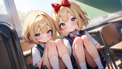 1girl, solo, loli,sitting,sitting on the floor grasping one's knees, spaced_out, on_hill, looking_at_sky, waiting, sky, cloudy_sky, blue_sky, sunrise, sunset, beautiful_detailed_sky, nature, scenery, anime, anime_style, short_hair, blonde_hair, blue_eyes, red_hair_bow, (hair_bow:1.5), side_blunt_bangs, hairs_between_eyes, wind, breeze (wind:1.2), grass, green_grass, flowers, white_flowers, yellow_flowers, trees, green_leaves, mountain, far_mountain, path, dirt_path, closed_mouth, white_dress, short_sleeves, pleated_skirt, bare_arms, bare_shoulders, collarbone, hair_tucked_behind_ear, hair_strand, long_bangs, ahoge, hair_ornament, hairclip, yellow_hairclip, flower_hairclip, outdoors, sun_rays, light_particles, lens_flare (light_particles:1.3), depth_of_field, cinematic_lighting