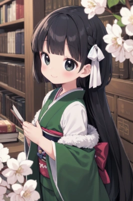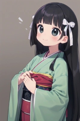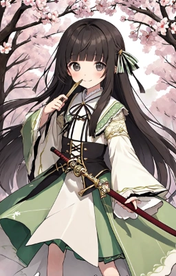 1 girl,(((very longest hair))),smile, Black hair,straight Hair,hair ribbon,mintgreen stripe,Black Eyes,flat chest,straight Across bangs,princess Cut, Very Long Sideburn,roundry Head,Droping eyes,cute,Meekness,Bob Cut,long back hair,12 years Old,loli,cherry blossom, sword,