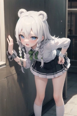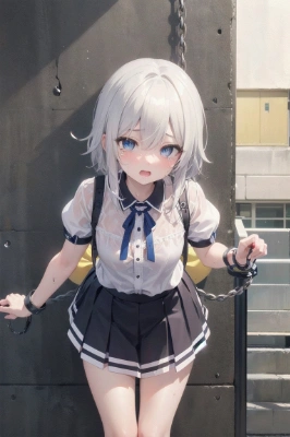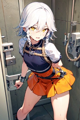 masterpiece, best quality, extremely detailed, anime hang a waist rope handcuff masterpiece, best quality, extremely detailed, anime masterpiece, best quality, extremely detailed, anime, girl, skirt 3D art, caught in a dim cell, yellow bob hair, 1 yellow bear, small tits, yellow eyes, both hands are handcuffed on the back, prisoner clothes, legs are shackled, leaning forward and looking at the front with a crying face , izayoi sakuya, wet hair, white hair, odd eyes,