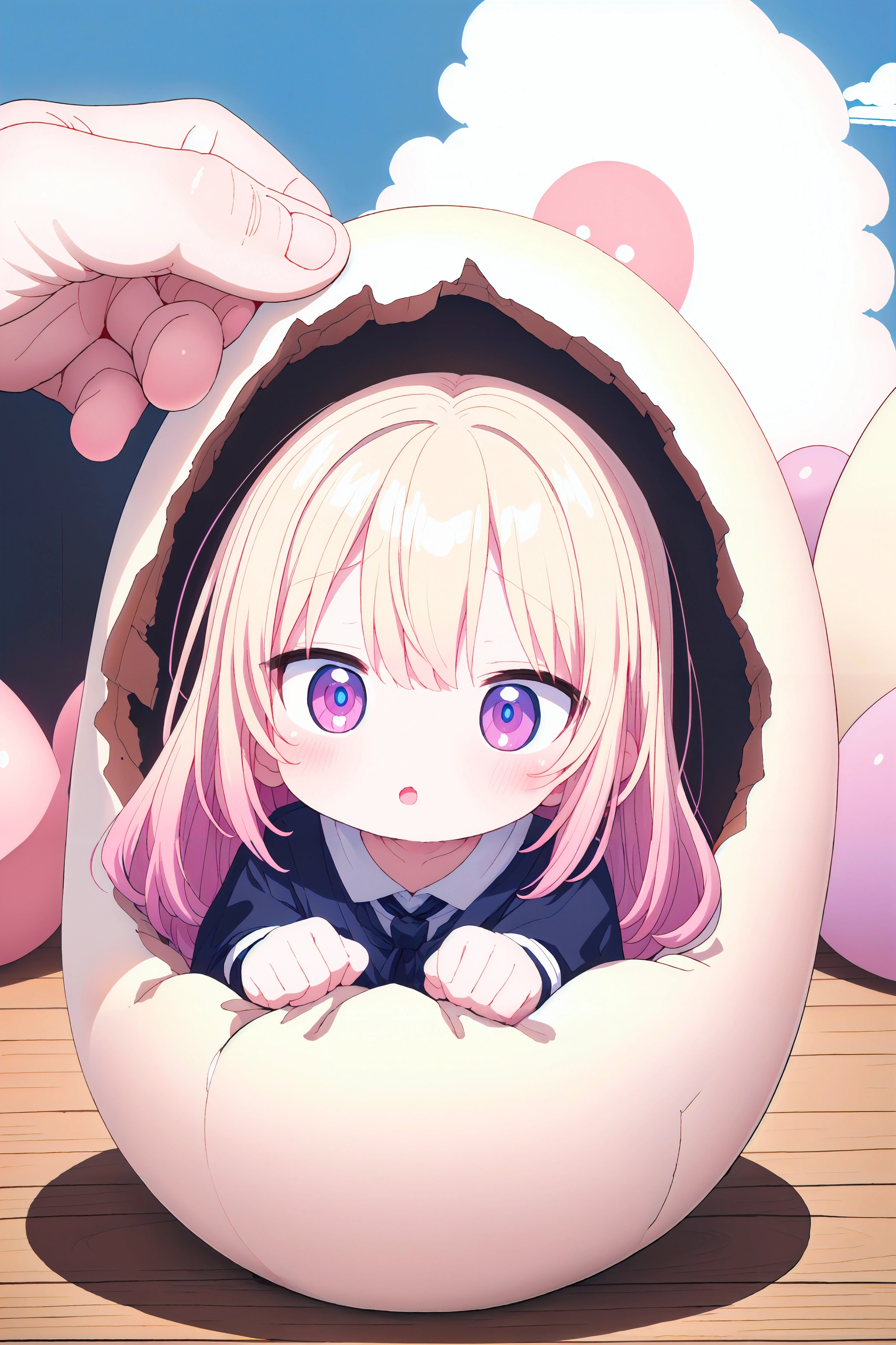 masterpiece, best quality, extremely detailed, 8k, 16k, extremely detailed eyes, delicate and intricate hair, color anime illustration, a little girl, 2 head body, chibi, (giant cracked egg:1.2), (head is sticking out of giant egg:1.3), <lora:hatched egg-001_0.7:1.5>, <lora:flat2:-0.6>