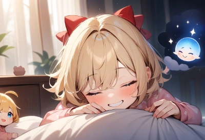 1girl, short hair, blonde hair, blue eyes, hair bow, red bow, pajama, bed, deep sleep, dreaming, fantasy, imaginary world, happy dream, smiling, blissful face, cute, delicate, beautiful, detailed, masterpiece, best quality, very aesthetic, (deep sleep:1.2), (dreaming:1.3), (fantasy:1.2), (imaginary world:1.2), (happy dream:1.3), (smiling:1.2), (blissful face:1.2), (cute:1.2), (delicate:1.1), (beautiful:1.1), (masterpiece:1.3), (best quality:1.3), (very aesthetic:1.3)