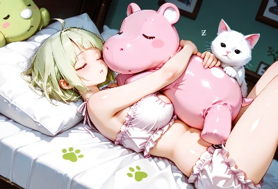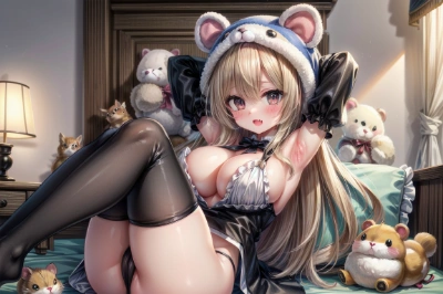 anatomy), (1 girl), large breast, adult, sexy, (breast out), blonde hair, cignon, (hamster kigurumi), (arms and legs on floor), (put hamster stuffed animal on back), skin fang, blush, (fancy bedroom), white skin, (super fine illustration), <lora:hairdetailer:0.8>