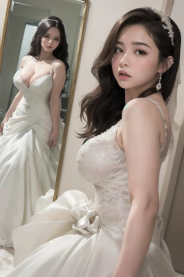 masterpiece, best quality, (photorealistic: 1.6), 1 girl, (looking at viewer: 1.3), (shoot from side: 1.3), (arching back: 1.3), (bedroom: 1.3), small body, (gigantic bosoms: 1.8), (gigantic hips: 1.5), (gigantic thighs: 1.4), (curvy: 1.6), Japanese idol, gal, wavy hair, teenager, (shiny skin; 1.8), (wedding dress: 1.4), (worried expression: 1.5), pouty lips,,,,,