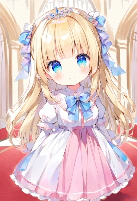 (solo cute cute loli loli lo-li loli:1.0),watercolor, pastel color, watercolorAND (((medium length hair)),blunt bangs,look at viewer,brown half,upper body, smiling,Princess, blonde, light blue eyes, palace hall, red carpet,medium breasts,,,