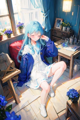 masterpiece, best quality, extremely detailed, (illustration, official art:1.1), 1 girl ,(((( light blue long hair)))), light blue hair, ,10 years old, long hair ((blush)) , cute face, big eyes, masterpiece, best quality,(((((a very delicate and beautiful girl))))),Amazing,beautiful detailed eyes,blunt bangs((((little delicate girl)))),tareme(true beautiful:1.2), sense of depth,dynamic angle,,,, affectionate smile, (true beautiful:1.2),,(tiny 1girl model:1.2),)(flat chest)),(Master photography:1.4),(Beautiful and delicate girl:1.2),green light, tranquil, no lineart, Maya Hotel, abandoned room, big windows, leaves are falling, 1gitl sitting on wooden chair, light blue hair and white dress, closed eyes,(sitting with one knee up:1.1), cardigan, luminous glow, mystic atmosphere, depth of field, dynamic angle, light particle effect, light leaks, aerial effect, blue flowers,look into viewers, look into viewers,(sitting with one knee up:1.1), cardigan, luminous glow, mystic atmosphere, depth of field, dynamic angle, light particle effect, light leaks, aerial effect, blue flowers,look into viewers, look into viewers <lora:sanDka1:1> <lora:make25d_type4_v100:1> ,