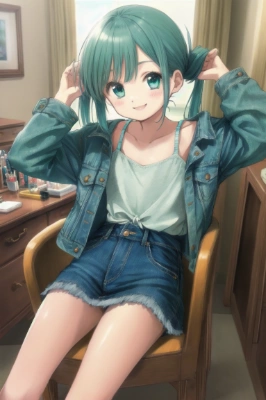 masterpiece, best quality, highres, 1otoko no ko, solo, denim jacket, Denim skirt, かわいい, flat chest, aqua hair, aqua eyes, Twintails, tying hair, smile, 16 yo, nice hands, perfect hands, girly room, dressing table, sitting chair, in front of dressing table<lora:flat2:0> <lora:hairdetailer:0.5><lora:GoodHands-vanilla:1>