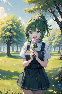 masterpiece, best quality, extremely detailed, anime, girl, skirt, sitting, happy, laughing, picnic, panty shot, sunny day, forest, mountain, spring, morning, flower, colorful, original character, my child, younger sister, green eyes, green hair, ponytail, ahoge, girl、Little Red Riding Hood, cute wolf,,