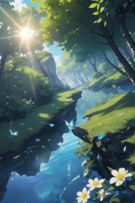 3D background art,masterpiece, best quality, extremely detailed, anime,out angle,of forest clear water,break,beautiful blue Butterflies is flying like a flutter.lens flare,<lora:apstyle2:1>,,,