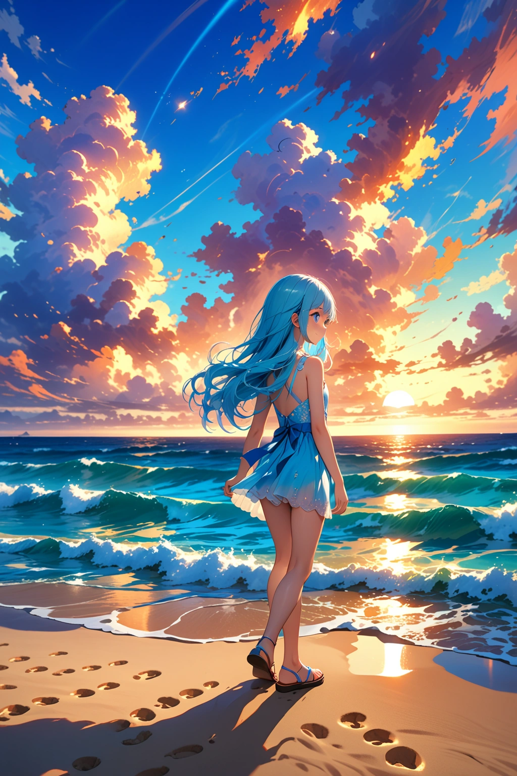 masterpiece, best quality, extremely detailed, (illustration, official art:1.1), 1 girl ,(((( light blue long hair)))), ,(((( light blue long hair)))),light blue hair, ,10 years old, long hair ((blush)) , cute face, big eyes, masterpiece, best quality,(((((a very delicate and beautiful girl))))),Amazing,beautiful detailed eyes,blunt bangs((((little delicate girl)))),tareme(true beautiful:1.2), sense of depth,dynamic angle,,,, affectionate smile, (true beautiful:1.2),,(tiny 1girl model:1.2),)(flat chest)),masterpiece,best quality, masterpiece, highres, best qualtiy,tmasterpiece,超高分辨率,(真实感:1.4),RAW photogr,warm lights,The sea and the beach,1girl,Walking on the beach,White color blouse,Short skirt,sandals,the setting sun,footprints,(slim,dignified,shyexpression),Beautiful teenage girl,Beautiful goddess,Detailed scenes, Beautiful digital illustration, the detail,Hyper-detailed, Cinematic quality,((from below)) , , <lora:sanDka2:1> <lora:yawanuri:1> ,,