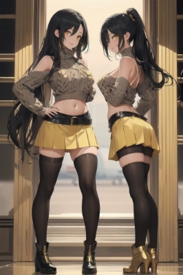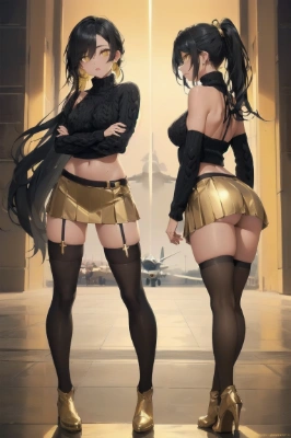 (multicolor black hair and gold stripe wild long hair with volume and high messy ponytail), (black hair: 1.3), (gold hair: 1.2), (black shoulder less sweater: 1.5), (black thigh high stockings: 1.3), (light brown leather boots), (yellow long skirt: 1.3), (divine), (voluptuous), (goddess), (midriff, navel), (athletic body), (slim thighs), (thin waist), (perfect hip), (broad shoulders), (soft saggy supple breasts), (((golden eyes, constricted irises, shrunken pupil, cross eyed, wide open eyes, large eyes))), (masterpiece), (sweaty), (highly detailed), (full body view), (((tanned skin))), (solo female) , Profile Stand, Crossed Arms , Standing airport runway , fighter jet on back, dynamic angle,,fighter jet or airplane or aircraft, <lora:hairdetailer:0> <lora:eyecolle_nishikigi_v100:1> ,