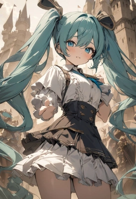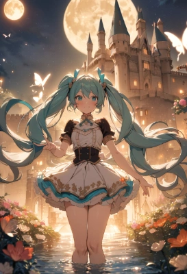 masterpiece, best quality, extremely detailed, anime, girl, skirtmasterpiece, best quality, extremely detailed, anime, girl, 1girl, hatsune miku, vocaloid,Twintails,Princess,longhair,princess,butterfly,flower,castle,fantasy,night,moon,full moon,space,starry sky,night sky,sea,Sepia,twintail