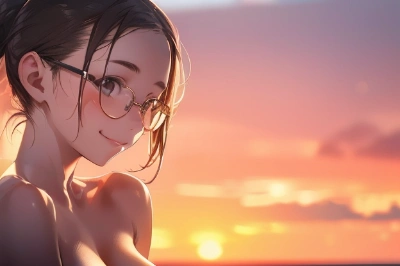 1girl, (supreme innocent and cute face, perfect detailed face), (masterpiece, best quality), perfect anatomy, perfect lighting, (8K, 4K:1.4), ultra-detailed,delicate features,delicate skin,realism,beautiful lighting,cowboy shot, The girl on the right side of the screen, 1mature female,curvy,15 years old,small breasts,brown hair,short ponytail,slanted eyes,glasses,embarrassed,bikini,gleaming skin,(in heat:1.4),sunset beach,Backlit,more_details:1.5, smile, ,delicate colors, illustration, bright colors, beautiful,Koneko Toujou (DXD) white hair short hair, black cat style hair clip, white cat ears, loli, young,