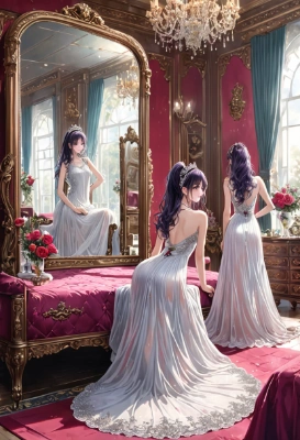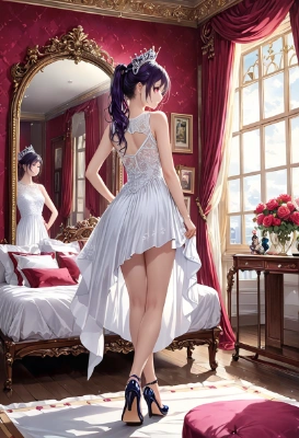 masterpiece, best quality, extremely detailed,((( jersey dress))),Ultra Detailed, Ultra Detailed background,1 girl front mirror, bed,big hips, brush,little breast,((see-through thin white long dress)),heeled shoes,wet arms,wet buttocks,((show back)),black violet hair,ponytail,wind hair,rose red eyes,(((brush))), tiara, ((Alice band)),(((lying down))),((touching hips)),((mirror)),long chair, <lora:hairdetailer:0> <lora:make25d_type1_v100:1> ,,,,,,,,,,,,,,,