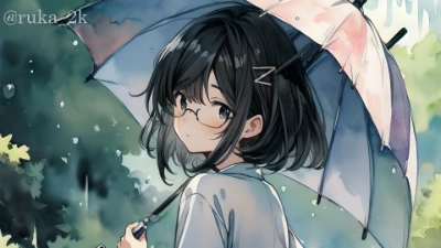 (roughly drawn watercolor:1.2), masterpiece, best quality, extremely detailed, anime, looking away, upper boddy, young lady, 18yo, tiny, bobcut, ((black hair:2.0)), black eyes, small eyes, round eyes, wearing glasses, wearing big Hairpin, back view, looking back, pouring rain, face down, melancholy expression,umbrella <lora:flat2:-1> <lora:saturation:-0.2>