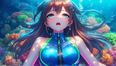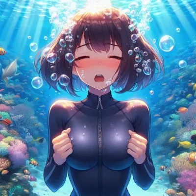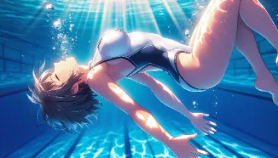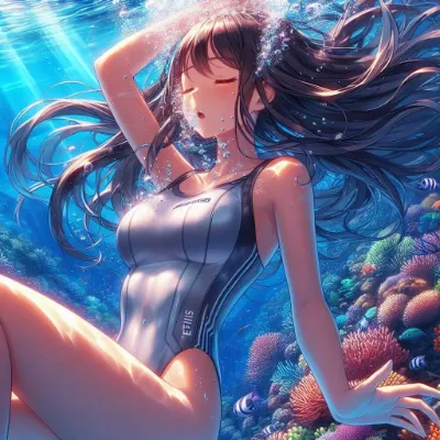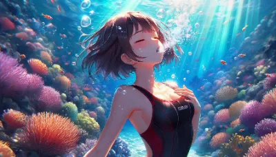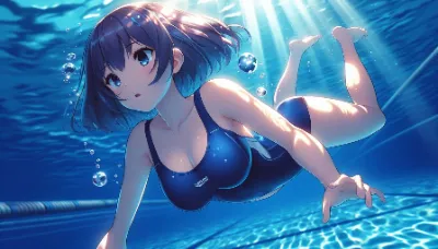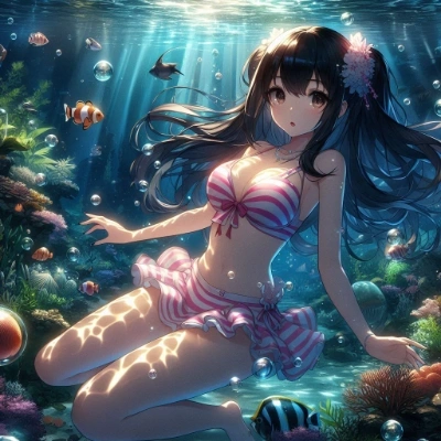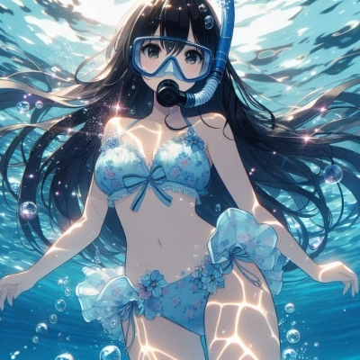 Wide anime-style illustration of an East Asian girl with long black hair, wearing a light blue, floral-patterned bikini with hip frills and diving mask. She\'s snorkeling underwater in a clear large lake, with bubbles trailing behind her in a dynamic swirl. Light refractions from the water\'s surface create a mosaic of dancing lights around her, enhancing the tranquil atmosphere.