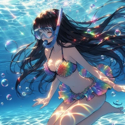 Wide anime-style illustration of an East Asian girl with long black hair, wearing a light blue, floral-patterned bikini with hip frills and diving mask. She's snorkeling underwater in a clear large lake, with bubbles trailing behind her in a dynamic swirl. Light refractions from the water's surface create a mosaic of dancing lights around her, enhancing the tranquil atmosphere.