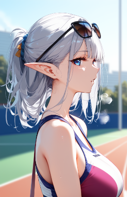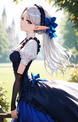 score_9,score_8_up,1girl,elf ears,solo,outdoors,silver hair,,,doyagao,tied back,blurry background,blurry,parted lips,blue eyes,looking at viewer,(victorian era dress),(I bent down to pet my dog.:1.4),depth of field,dieselpunk cloister evening, ,profile,