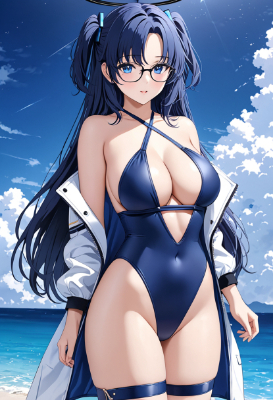 masterpiece, best quality, extremely detailed, anime, wearing a jacket and skirt, 1girl, yuuka (blue archive), blue eyes, halo, dark blue hair, parted bangs, long hair, solo, (two side up), breast, thighs, boots, glasses, white jacket, (dark blue swimsuit high leg swimsuit, slingshot swimsuit, criss-cross halter, cleavage, navel:1.3) , sandal, <lora:eyecolle_ageratum_v100:1> ,,,,,,