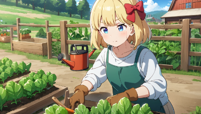 1girl,solo,blonde hair,short hair,blue eyes,(hair bow:1.3),red bow,(anime style:1.2),young,petite,casual home wear,apron,standing in kitchen,chopping vegetables,making salad,focused expression,holding knife,cutting board,fresh vegetables,kitchen counter,(detailed food:1.2),sunlight through window,modern kitchen appliances,refrigerator in background,sink,cabinets,cooking utensils,bowl for salad,colorful vegetables,tomatoes,lettuce,cucumbers,carrots,kitchen timer,recipe book open nearby,(masterpiece:1.3),(best quality:1.3),(very aesthetic:1.2),absurdres,