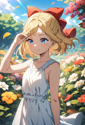 1girl,solo,blonde hair,short hair,blue eyes,hair bow,red bow,(anime style:1.2),young,petite,casual outfit,standing,slot machine,casino,(jackpot:1.3),coins spilling out,surprised expression,wide eyes,open mouth,hands raised,excitement,flashing lights,coin shower,golden glow,casino floor,other slot machines,neon signs,carpet pattern,(detailed coins:1.2),sound effects visible,lucky symbols on slot machine,lever pulled,digital display showing win,(masterpiece:1.3),(best quality:1.3),(very aesthetic:1.2),absurdres,